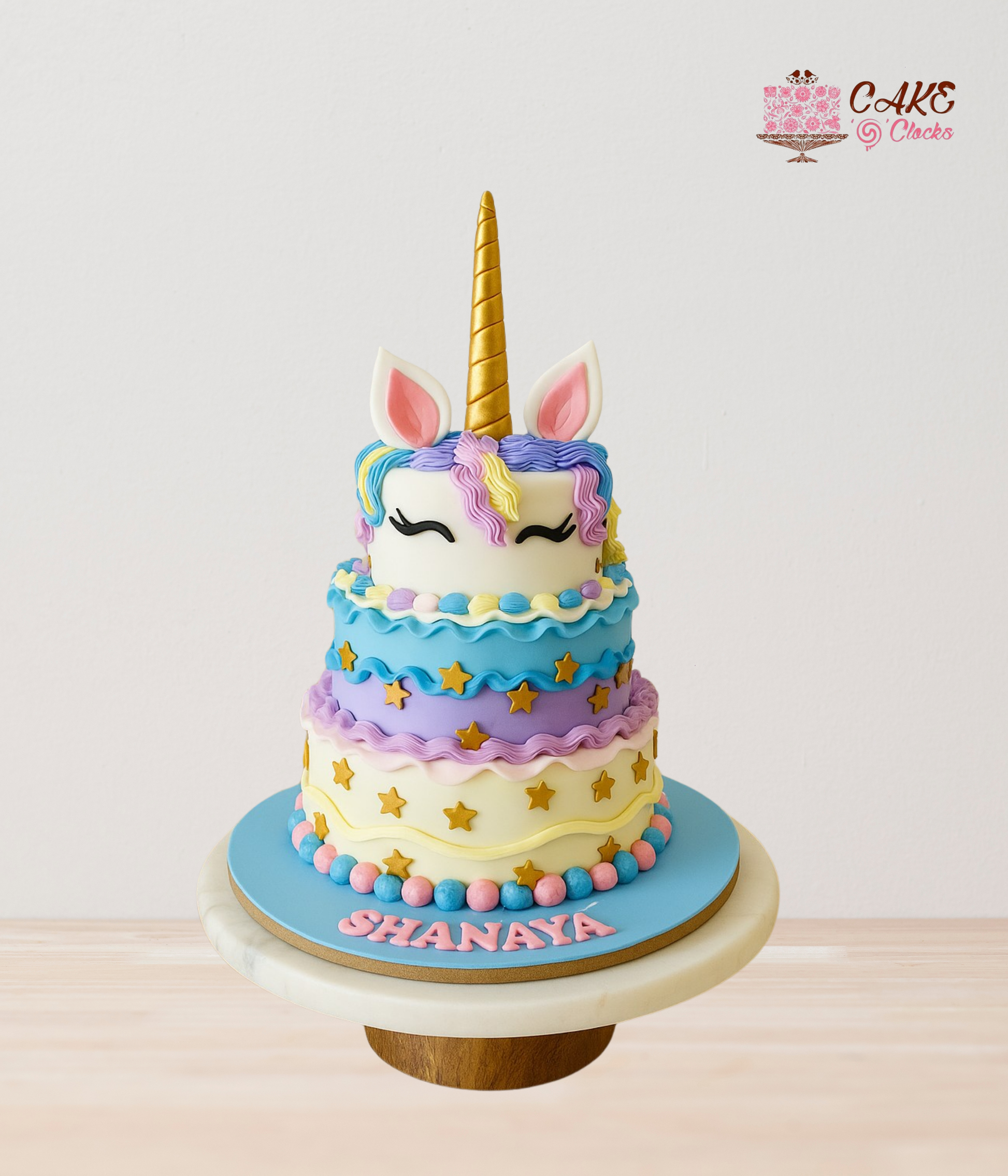 Magical unicorn cake with pastel colors, golden horn, and star details. Perfect for kids’ birthdays and fantasy-themed celebrations.