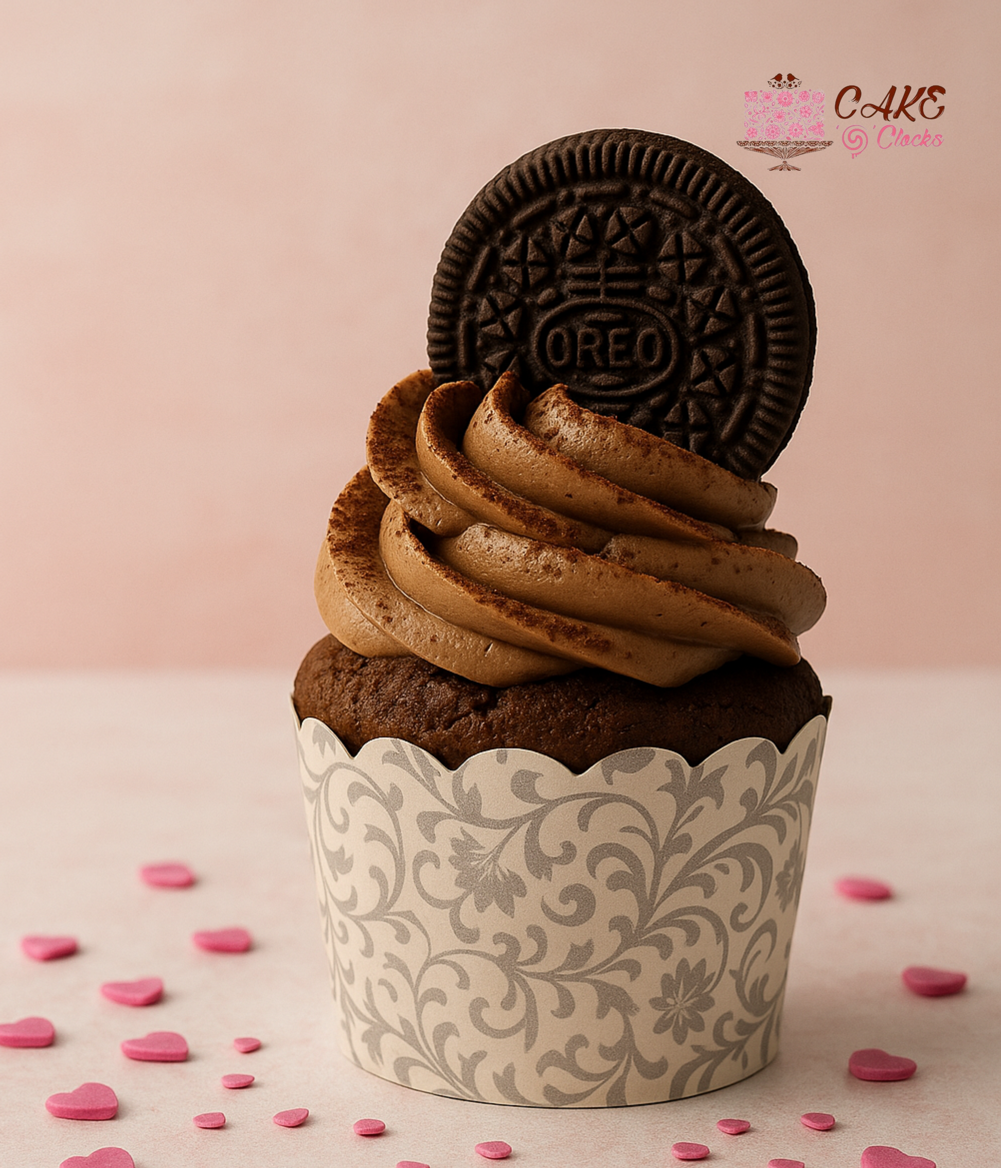 Indulge in our Choco Oreo Delight Cupcake – rich chocolate base topped with creamy frosting and a crunchy Oreo for the perfect treat.