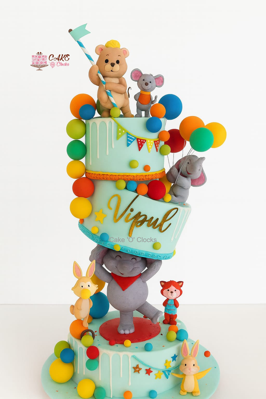 Colorful anti-gravity circus cake with elephants, lions, rabbits, and balloons. A grand luxury centerpiece for carnival-themed parties.