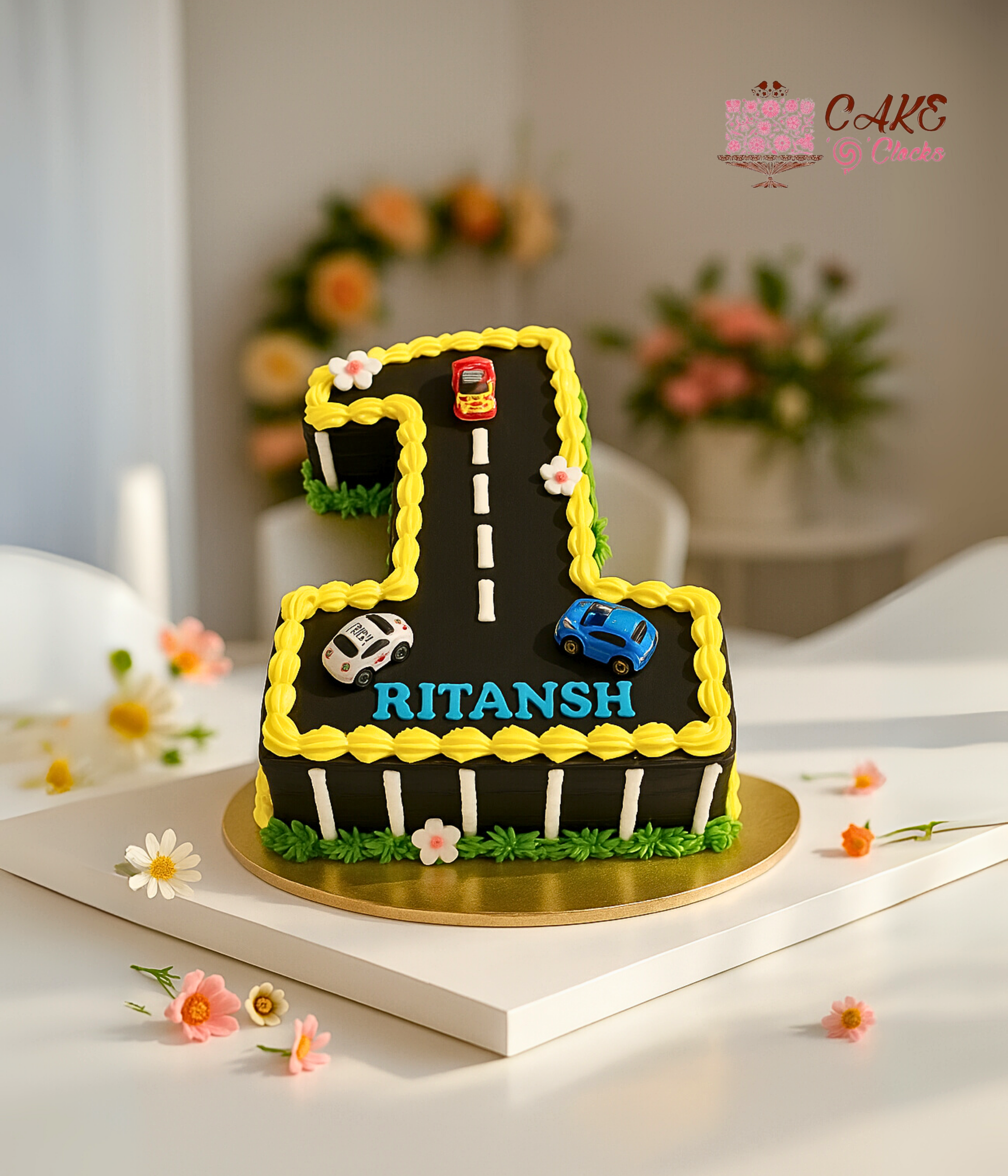 "Unique number 1 shaped cake with racing track design and toy cars. A fun and creative 1st birthday cake idea for boys and girls who love cars.