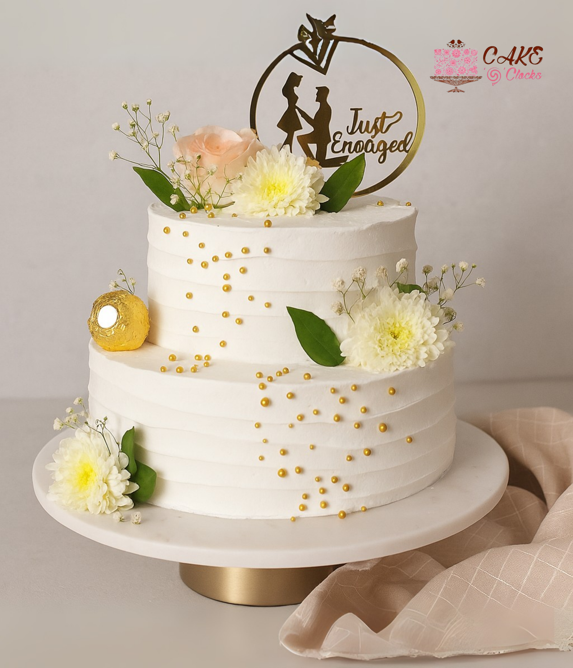 Celebrate love with this elegant two-tier white buttercream cake, adorned with fresh flowers, golden pearls, and a romantic “Just Engaged” topper — perfect for engagement parties.
