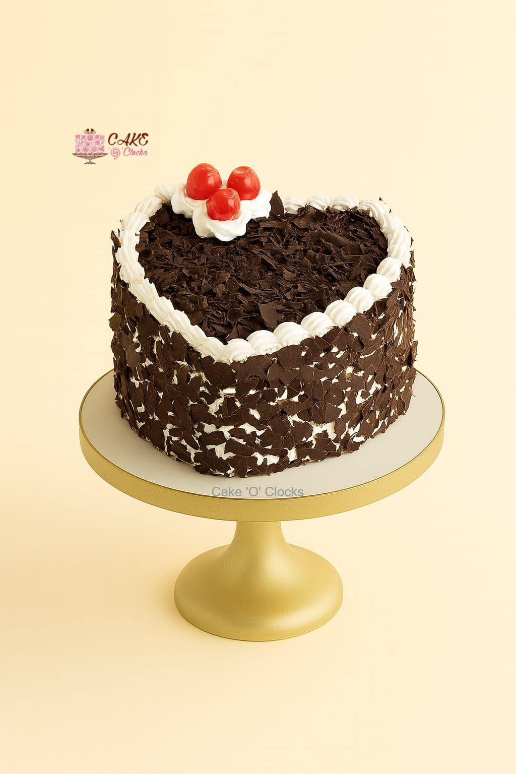 A romantic twist on the classic, this heart-shaped Black Forest cake is loaded with chocolate flakes, cream, and cherries. Ideal for anniversaries, weddings, and special surprises.