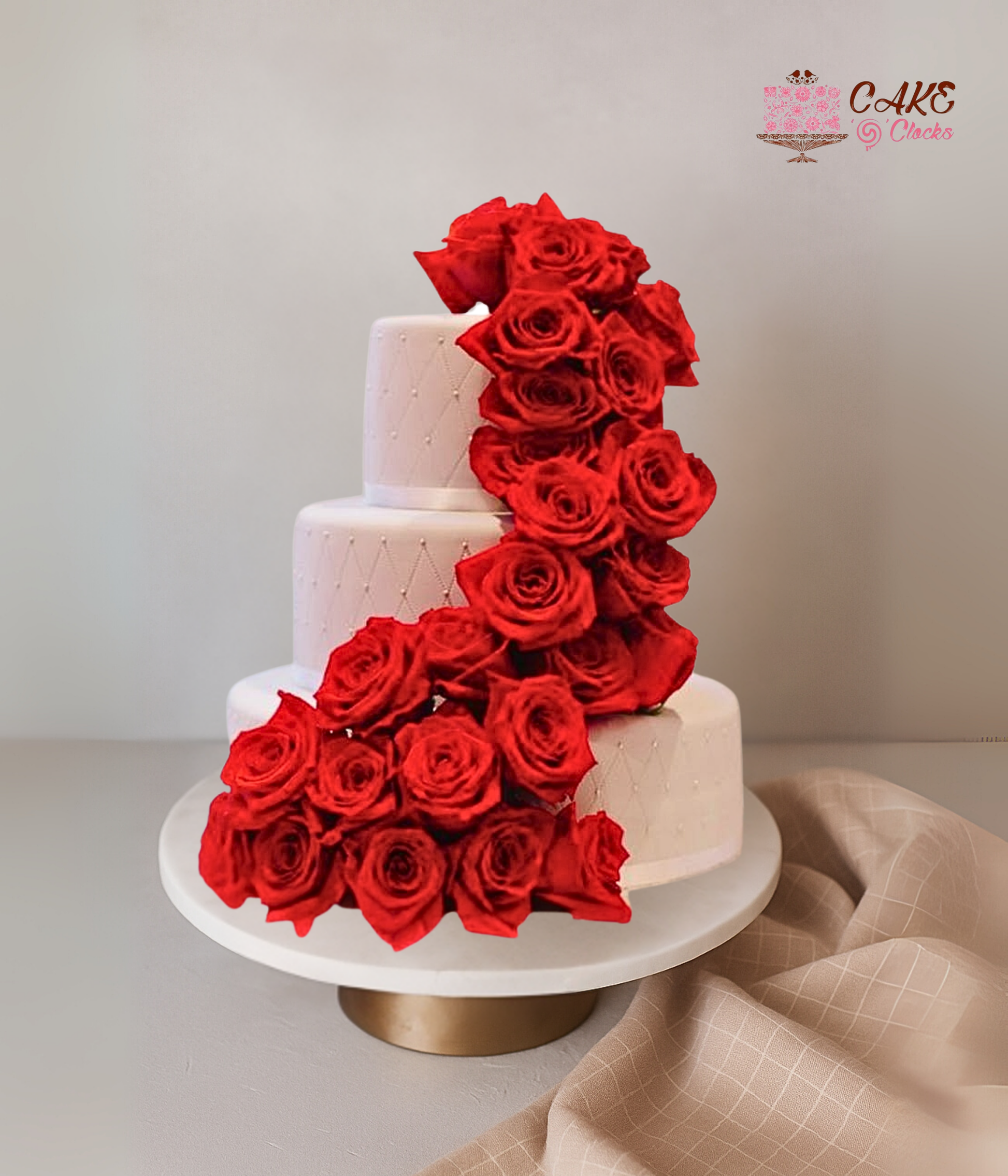 A stunning three-tier white cake draped with a dramatic cascade of fresh red roses, creating the ultimate showstopper for weddings and grand events.