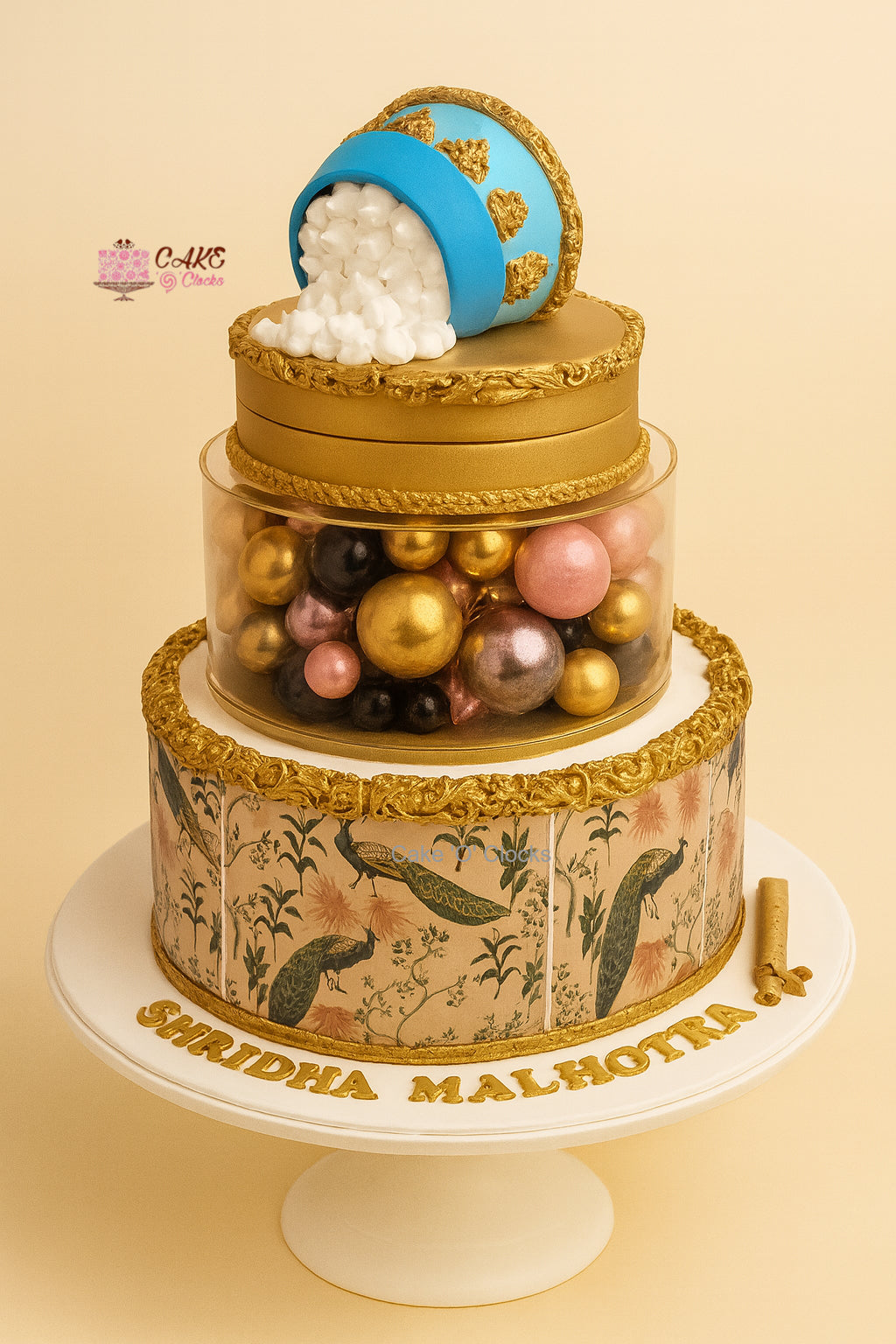 Inspired by Indian royalty, this cake features intricate peacock artwork, golden trims, and a spilling treasure pot. A showstopper for weddings and grand occasions.
